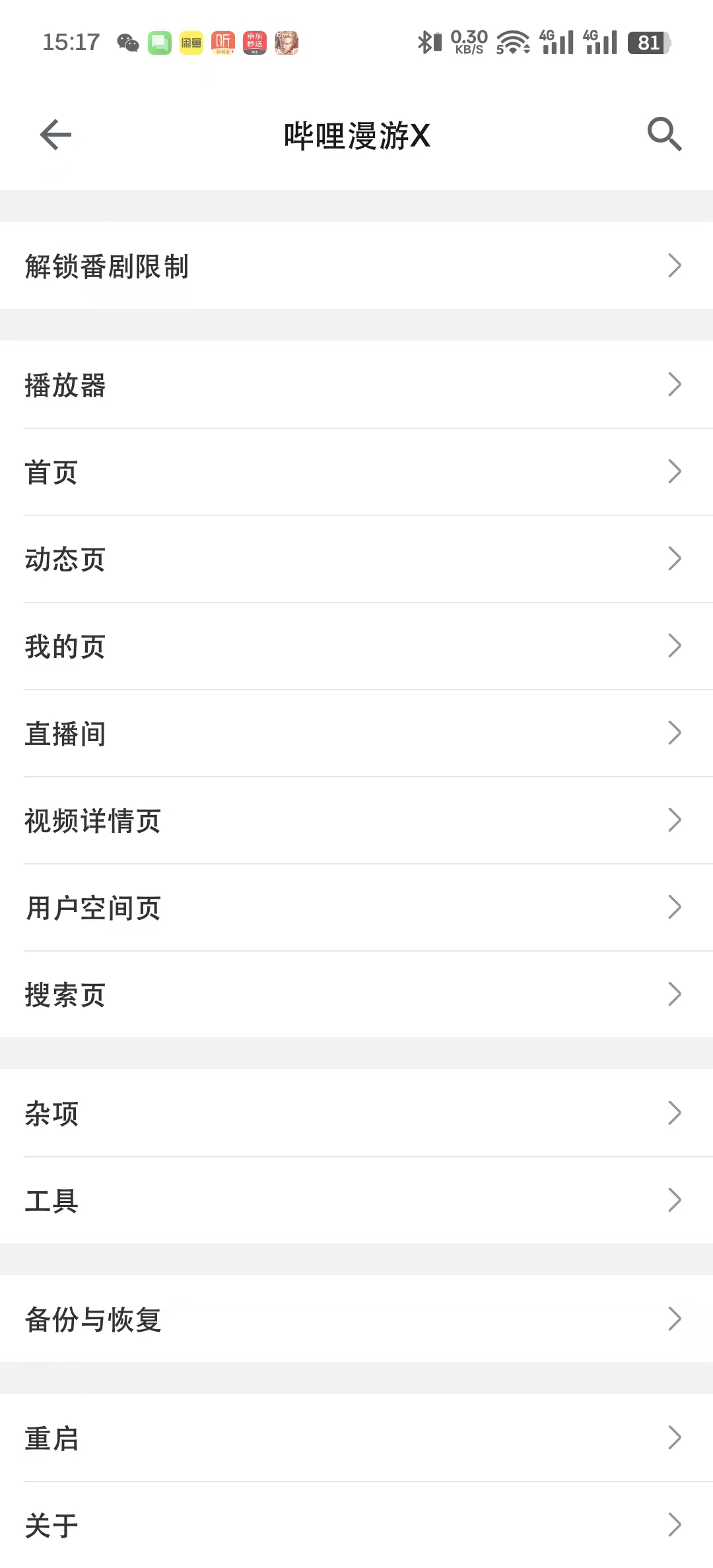 2、内置强大的漫游模块,可解锁番剧限制,以及可自定义精简哔哩哔哩界面!!!深度定制属于你自己的哔哩哔哩!!{模块位置,哔哩哔哩-我的-设置-哔哩漫游X}